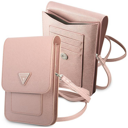 Markowa torba na smartphone`a wykonana jest ze skóry ekologicznej o luksusowej fakturze Saffiano, zamykana na magnetyczny klips, wykończona trójkątnym logo Guess.
