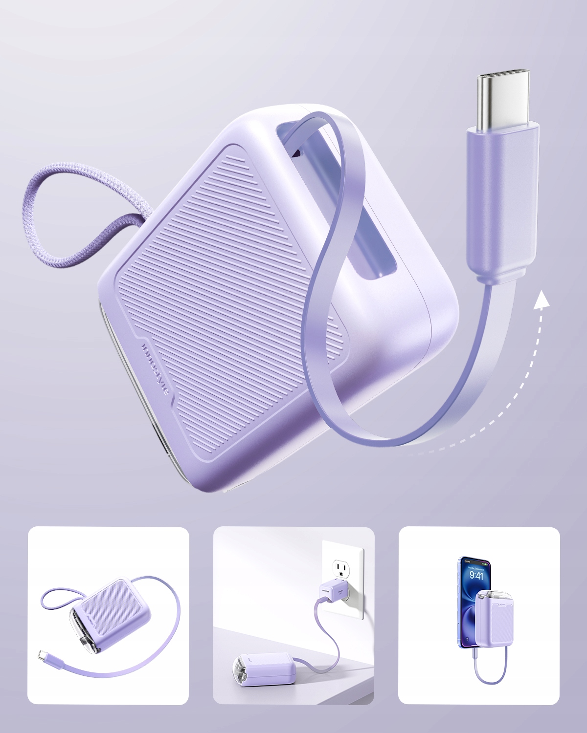- Wbudowany zwijany kabel USB-C: Natychmiastowe ładowanie wbudowanym zwijanym kablem o długości 60cm