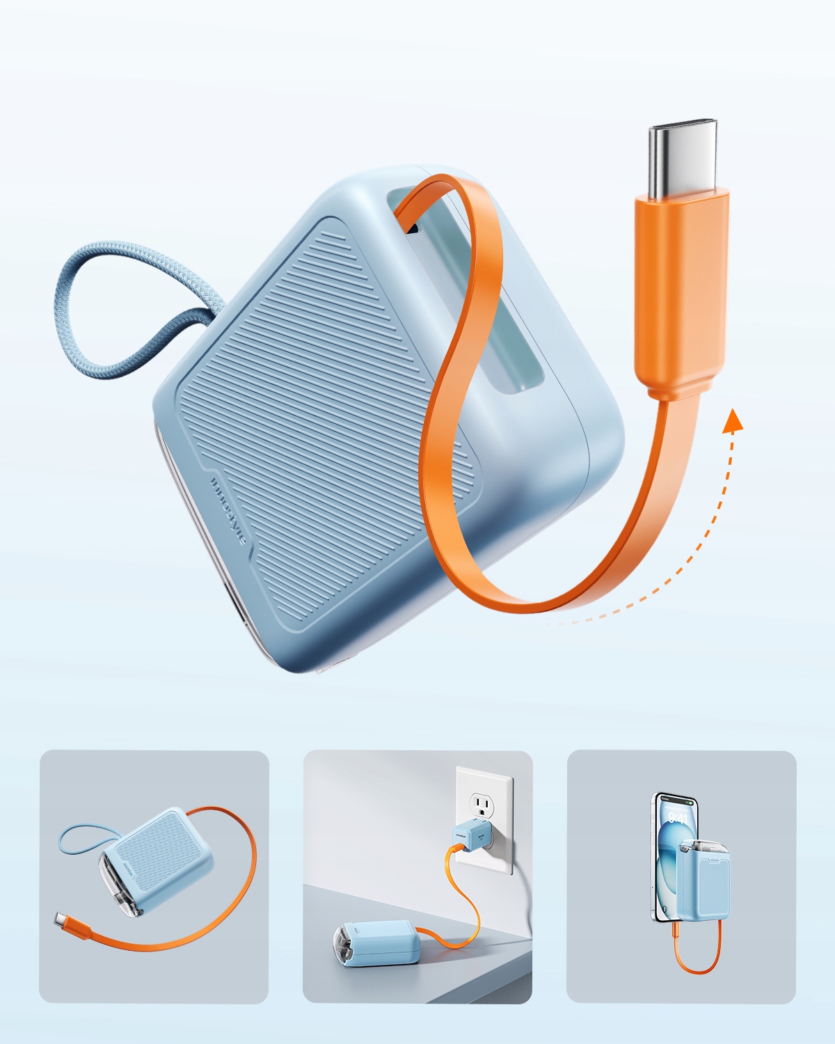 - Wbudowany zwijany kabel USB-C: Natychmiastowe ładowanie wbudowanym zwijanym kablem o długości 60cm
