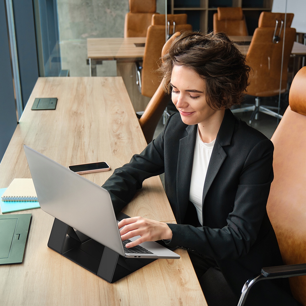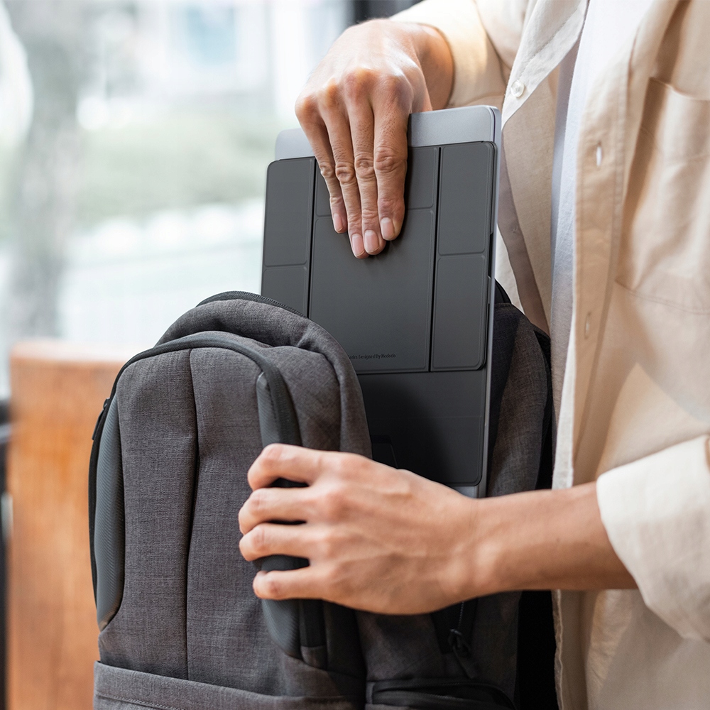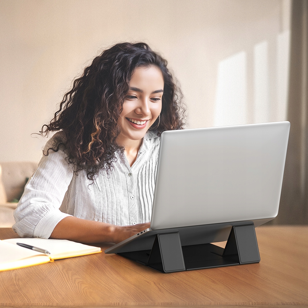 Podstawka ma zaledwie 4,5 mm grubości po złożeniu i waży tylko 275 g, co sprawia, że jest łatwa do schowania w torbie czy plecaku. Dzięki temu idealnie nadaje się do pracy zdalnej w podróży.