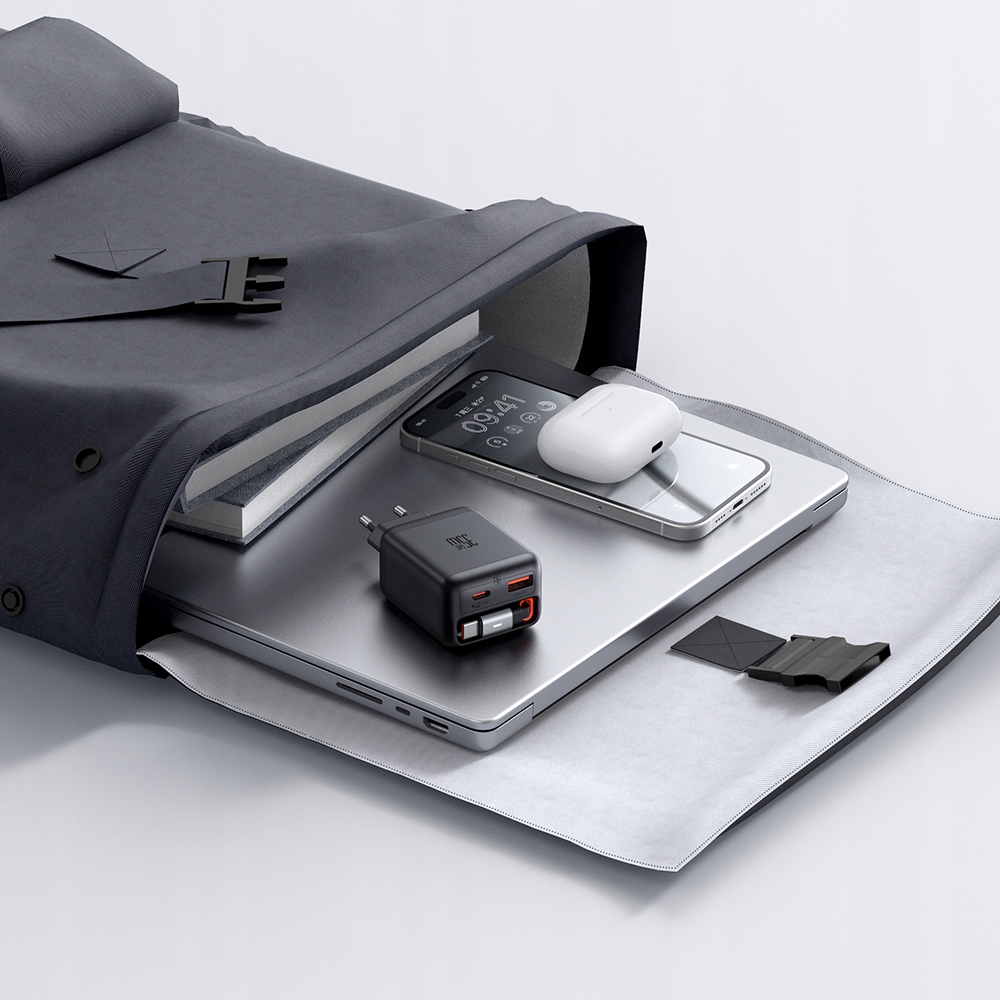 Ładowarka jest kompatybilna z szeroką gamą urządzeń. Od smartfonów (Apple, Samsung, Google), przez słuchawki i tablety, po laptopy i konsole (np. Nintendo Switch). Trzy wyjścia (USB-C, USB-A i kabel USB-C) umożliwiają jednoczesne ładowanie kilku sprzętów.